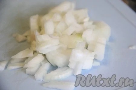 Лук режем мелкими кубиками. Одну луковицу будем использовать для обжарки овощей, другую - для грибов.