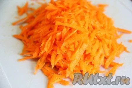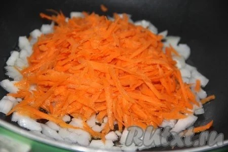 Крупную сладкую морковь натираю на крупной терке и отправляю к луку. Все перемешиваю и тушу овощи под крышкой в течение пяти минут.