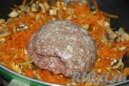 Затем добавить в сковороду фарш. Массу тщательно перемешать и обжарить на небольшом огне в течение 10 минут, периодически перемешивая.