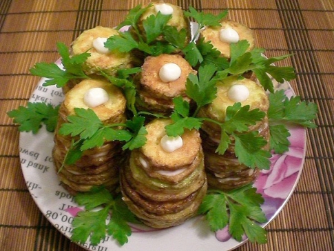 Жареные кабачки смазываем соусом и сооружаем из них аккуратные пирамидки.