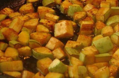 Разогреваем глубокую сковороду (сотейник). Наливаем туда немного растительного масла (так, чтобы покрыть всё дно сковороды тонким, 1-2 мм, слоем масла). Выкладываем в сковороду нарезанные кубиками кабачки.